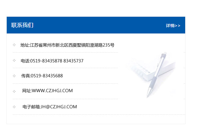 地址:常州市新北區友邦商務大廈1幢16、17層  電話:0519-85101652  傳真:0519-85112595  郵編:213022  網址:www.cz-jiayue_cn.e-yous.com  郵箱:xiajifengaa@163.com